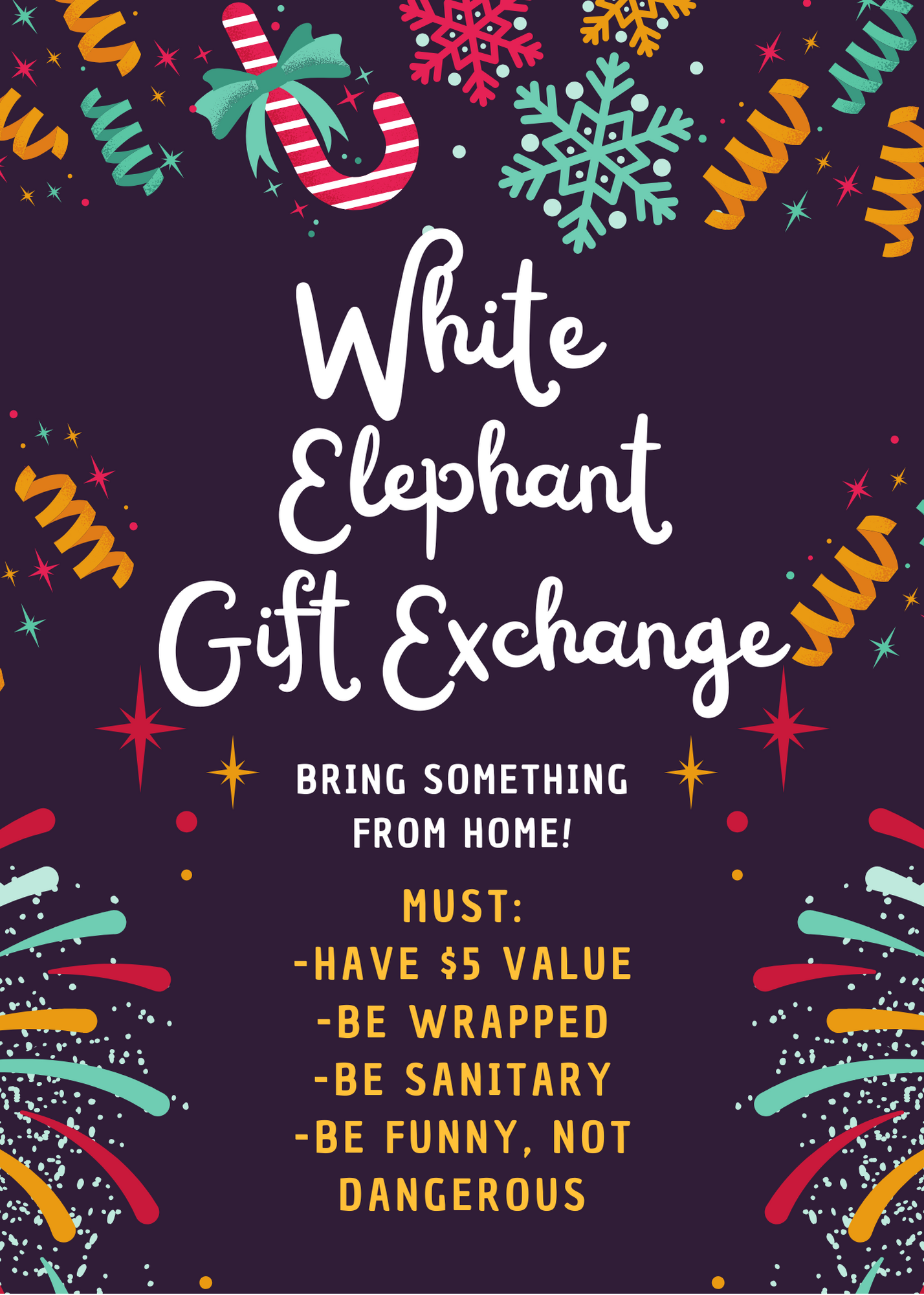 GIFT EXCHANGE: Don’t forget a wrapped white elephant gift equivalent to $5! Think: “what’s the best thing I can get for $5?”.